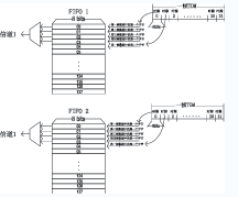 FIFO中的四幀數(shù)據(jù)被讀空時(shí)間大于第五幀的第一個(gè)字節(jié)寫(xiě)入FIFO的準(zhǔn)備時(shí)間,F(xiàn)IFO的寫(xiě)滿(mǎn)與讀空都是有硬件產(chǎn)生信號(hào)標(biāo)識(shí),此時(shí)FIFO讀空信號(hào)標(biāo)識(shí)未產(chǎn)生,不能對(duì)同一FIFO進(jìn)行寫(xiě)操作,導(dǎo)致待寫(xiě)數(shù)據(jù)丟失。因此選用兩個(gè)FIFO采用乒乓機(jī)制來(lái)切換讀寫(xiě)操作,如圖4所示!