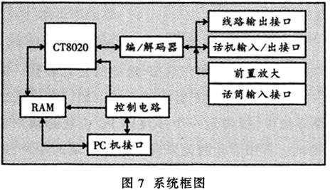 ——硬件平臺構(gòu)造于PC機(jī)上,采用ISA總線插卡方式,如圖7所示。該平臺采用了美國DSPG公司的專用數(shù)字信號處理器CT8020作為核心部件,利用先進(jìn)的可編程邏輯器件開發(fā)了外圍控制電路和接口電路。它主要完成以下功能。