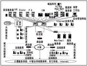 該方案采用Cisco的ICM中間件軟件作為系統(tǒng)的CTI服務器軟件平臺,并采用相關廠商的IVR和Dialer產(chǎn)品作為IVR服務器和外撥服務器軟件。地市客服中心采用了交換機的遠端模塊設置遠端座席。Cisco的ICM中間件不但具有大話務量處理的高性能,而且支持多點呼叫中心的設置和基于純IP技術的呼叫中心的擴充,從而保證了系統(tǒng)的可擴展性。系統(tǒng)結構如圖1所示。