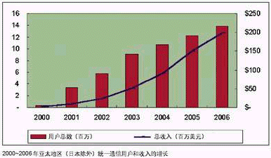 據(jù)IDC預(yù)測(cè),亞太地區(qū)(不包括日本)統(tǒng)一通信用戶數(shù)量將從2000年的32萬增長(zhǎng)到2006年的1385萬。盡管起點(diǎn)較低,收入將從2000年的119萬美元增長(zhǎng)到2006年的1.987億美元。這個(gè)增長(zhǎng)大部分受中國(guó)和澳大利亞推動(dòng),在這兩個(gè)國(guó)家,價(jià)格和市場(chǎng)由上層大電信公司決定。