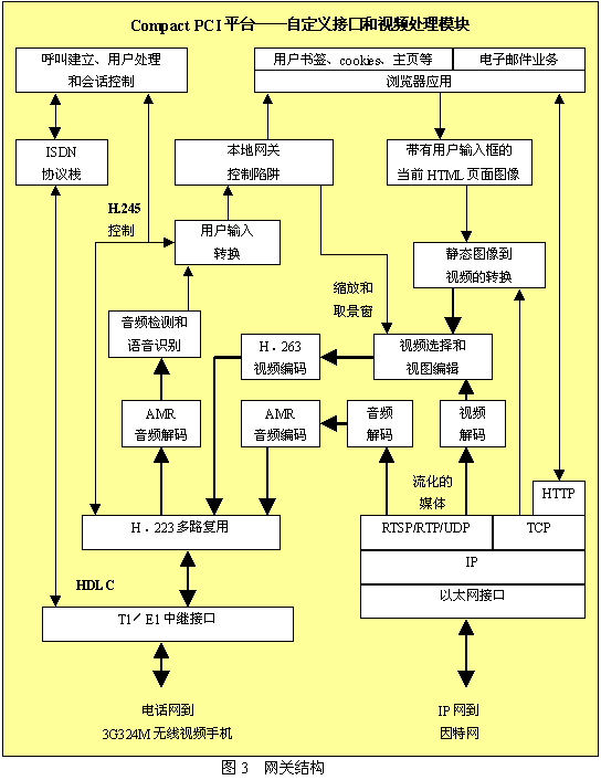 圖3所示為網(wǎng)關(guān)重要組成的分解圖。網(wǎng)關(guān)機(jī)箱很可能是一個(gè)Compact PCI機(jī)箱,機(jī)箱中包含了作為網(wǎng)絡(luò)中一個(gè)節(jié)點(diǎn)的所有組件。基本的視頻呼叫和瀏覽器應(yīng)用可以運(yùn)行在主處理器上,但T1或E1接口需要由附加模塊來支持。為了支持大量的端口,還需要附加的以太網(wǎng)接口和自定義的視頻處理模塊。T1/E1接口通過公共電話網(wǎng)接入無線交換中心,也可以直接接入到無線交換中心。以太網(wǎng)接口會通過標(biāo)準(zhǔn)IP路由器接入到因特網(wǎng)。