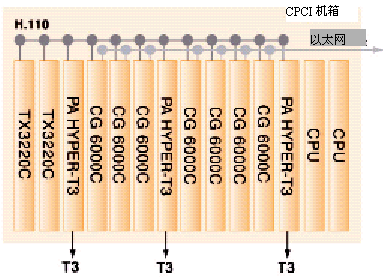 HYPER-T3接入適配板,它用于通過T3線上的1344個端口從PSTN接入語音和傳真媒體。這些媒體會從DS3轉(zhuǎn)換到DS0,然后通過H.110總線發(fā)送給6塊CG6000C中的一塊。CG6000C會壓縮這些語音和傳真媒體,然后用UDP/IP上實時協(xié)議(RTP)對它們進行打包。再通過板上的兩個以太網(wǎng)接口發(fā)送到一個語音級的IP包網(wǎng)絡上。請注意,每種板都使用了N+1板卡級的冗余備份。