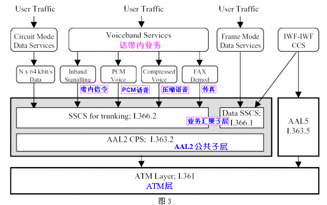 話帶業(yè)務(wù)包括標(biāo)準(zhǔn)PCM、壓縮語音和FAX等。它們在ATM網(wǎng)絡(luò)的傳輸主要有兩種方式:LES和VoIP/AAL5/ATM。