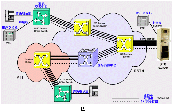 圖1給出了傳統(tǒng)電話網(wǎng)絡(luò)PSTN的組織結(jié)構(gòu)圖。它是目前規(guī)模最大的電話業(yè)務(wù)網(wǎng)絡(luò),通過標(biāo)準(zhǔn)的信令控制網(wǎng)絡(luò)(SS7),成為覆蓋全球的大型電話網(wǎng)絡(luò)。這個網(wǎng)絡(luò)和Internet互聯(lián)網(wǎng)有著驚人的相似,它們都采用級聯(lián)結(jié)構(gòu),具有易于擴(kuò)展的特性。