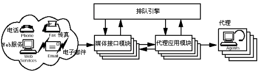 媒體交互模塊是跨媒體隊(duì)列結(jié)構(gòu)的通信入口。聯(lián)系中心所使用的每一種類型的媒體信道都與不同的模塊相關(guān)聯(lián),這些模塊檢測(cè)不同各自信道上的用戶請(qǐng)求,并將他們轉(zhuǎn)交給該隊(duì)列引擎。