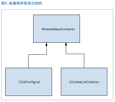 AparsedValueContainer類沒有數(shù)據(jù)和方法。它僅用于配合收集程序類的運行。(見圖3。)抽象收集程序類純虛擬功能CollectValues()的第二個影響因素是容器,當(dāng)在具體收集程序類實施中定義了容器時,必須使用通用的基礎(chǔ)類。所以在真正使用容器之前,必須在每個具體的收集程序類中進(jìn)行向下類型轉(zhuǎn)換。