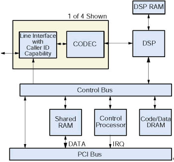 一個(gè)板卡上的微處理器控制D/4PCIU和D/4PCIUF通過(guò)一個(gè)本地總線控制板卡所有操作,它從主機(jī)截獲和執(zhí)行命令。這個(gè)微處理器處理實(shí)時(shí)的事件,管理和主機(jī)交互的數(shù)據(jù)流,提高系統(tǒng)的反應(yīng)時(shí)間,減少主機(jī)處理的需求,傳遞給應(yīng)用程序之前處理DTMF和電話(huà)信令,把DSP解脫出來(lái)專(zhuān)門(mén)做信令處理。這個(gè)微處理器和主機(jī)的通信是通過(guò)一個(gè)共享RAM,它作為一個(gè)輸入/輸出緩沖區(qū)增加的磁盤(pán)文件傳輸?shù)男。這個(gè)RAM和主機(jī)的接口是PCI總線。為了滿(mǎn)足實(shí)時(shí)系統(tǒng)的要求,所有操作的是中斷驅(qū)動(dòng)的。所有安裝在PC里面的D/4PCIUF板卡共享同一個(gè)中斷。在系統(tǒng)初始化的時(shí)候,固件從主機(jī)下載到板卡上的代碼/數(shù)據(jù)