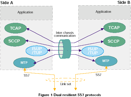 一個SS7系統(tǒng)使用ISUP、TUP或其他國家電話第4層電路交換控制協(xié)議,可以通過分離兩個物理實體(可以是同一機箱中或兩個獨立機箱的兩套板卡)之間的電路終端(每個電路有OPC、DPC和CIC組合唯一標識)達到容錯的目的。下面的描述討論兩個機箱的情況,盡管對于處理SS7和媒質的兩套板卡可以使用相同的方法。