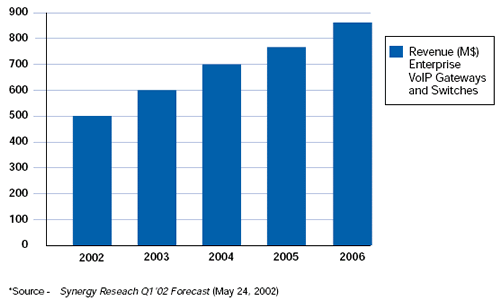 然后, Synergy也預(yù)測(cè)VoIP網(wǎng)關(guān)和交換應(yīng)用從2002年到2006年每年會(huì)有34.6%的增長(zhǎng). 需要產(chǎn)品來把傳統(tǒng)電話交換網(wǎng)絡(luò)和IP網(wǎng)絡(luò)橋接起來.