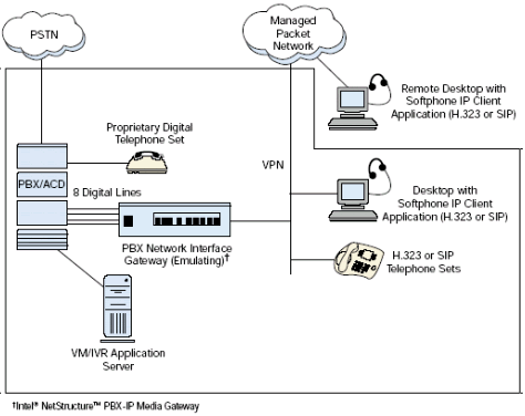 在任何電話上可以發(fā)送和接收呼叫, 使用VPN連接來傳送語音, PBX-IP 媒體網(wǎng)關(guān)是在IP網(wǎng)絡(luò)和PBX網(wǎng)絡(luò)的橋..